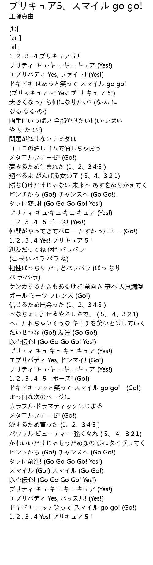 OP ふりがな付 うたてん 歌詞検索UtaTen 工藤真由 プリキュア5、スマイル go go!歌詞 よみ:ぷりきゅ 91,177 views みんなで踊ろう! 『 スマイルプリキュア! 』ED 振付:前田健 イェイ! イェイ! イェイ! 作詞:実ノ里 more Click